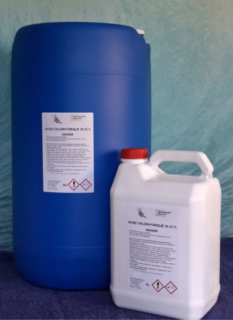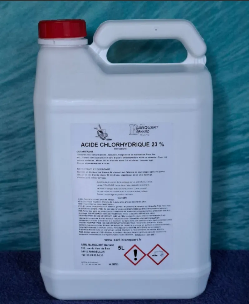 Pour faire baisser le pH d'un dixième, ajouter 0,1 litre d'acide chlorhydrique 23% pour 30 m3 d'eau. Verser l'acide dans les skimmers. - Nettoyant et décapant: Nettoie et décape les traces de ciments sur faïences et carrelages après la pose. Diluer 20 ml d'acide dans 80 ml d'eau. Appliquer avec une éponge. Frotter puis rincer à l'eau.