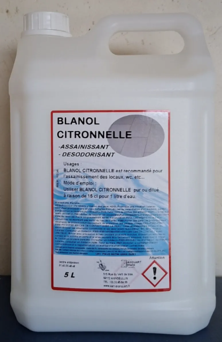 Utiliser BLANOL CITRONNELLE, pur ou dilué (15 cl pour 1 litre d’eau), dans votre eau de lavage pour l’assainissement des locaux d’habitation.
